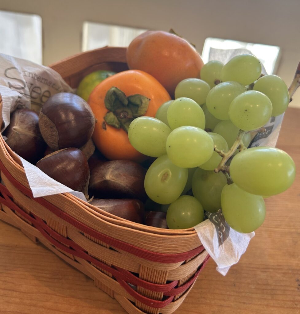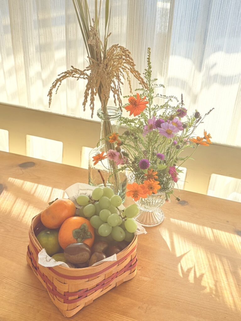 今が旬の果物を入れ、秋の花なども添えてテーブルに置いてみたら、とってもいい感じになりました👍